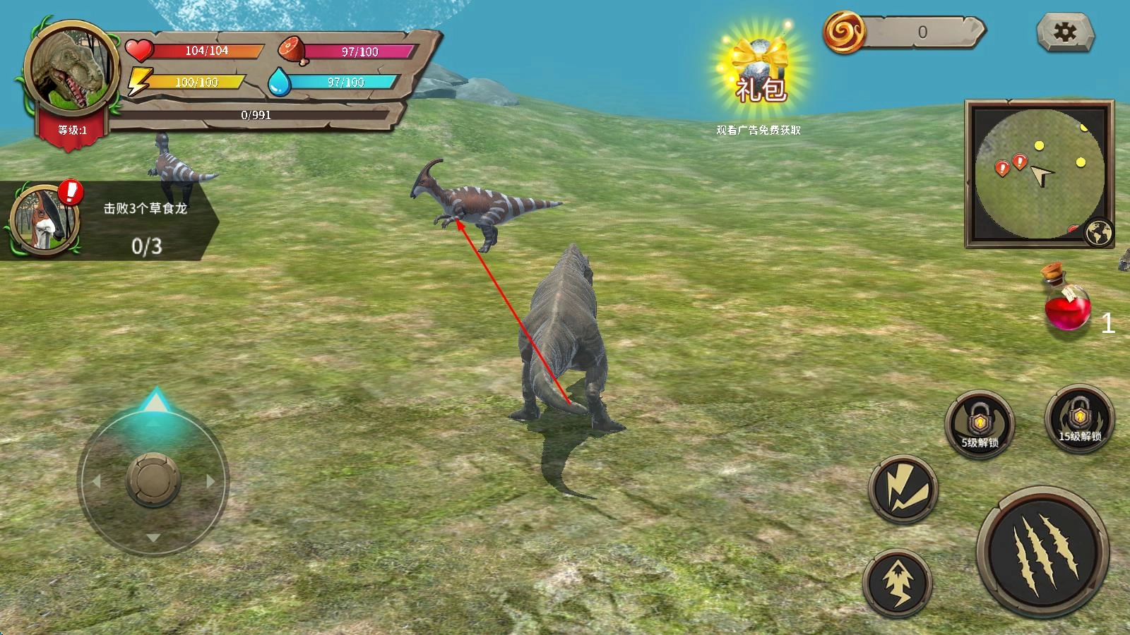 1、进入游戏后,从霸王龙、剑龙等多种恐龙中选择初始种类,在雨林场景中熟悉左下方轮盘控制移动、右侧滑动调整视角的基础操作,寻找小型生物练习吞噬。