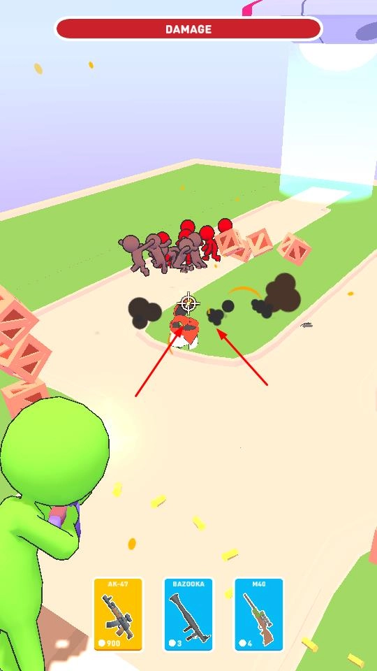 2、在射击过程中,关注上方显示的伤害值,努力提升伤害输出,击败更多的敌人,同时避开赛道上的障碍物,如木箱等。