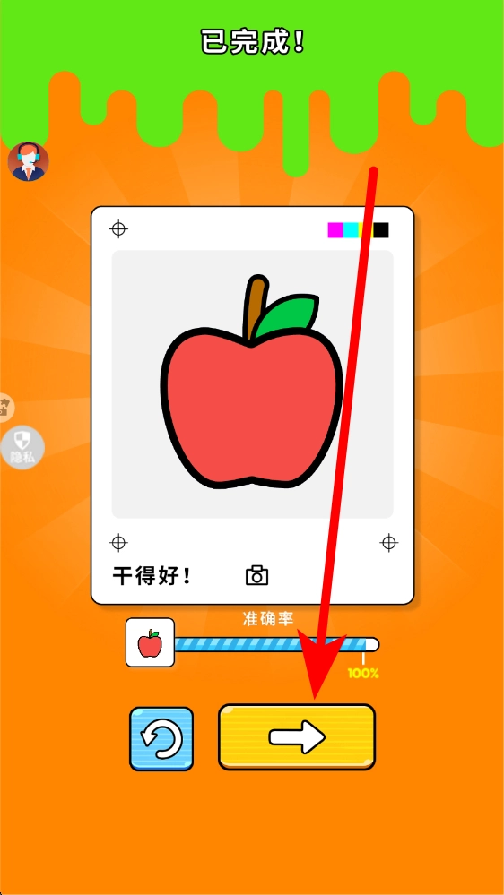3、当绘画与填色都完成后,若符合要求,会显示已完成,此时可点击箭头按钮,推进到下一个关卡,继续进行新的绘画创作,更多绘画乐趣。