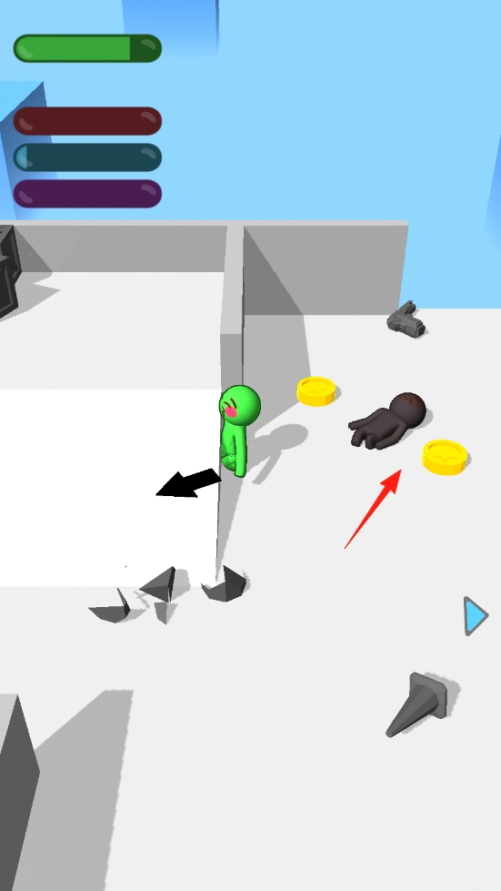 3、场景中包含墙体、带尖刺的障碍物、球体以及金币等元素,在战斗过程中,玩家能够借助地形实现穿墙移动,或是采用绕开掩体的策略来与对手展开对战。