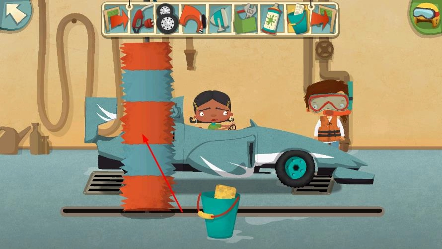 2、首先开展清洁工作,点击顶部的工具,使用红蓝配色的洗车装置对赛车车身进行清洗,以清除污渍。