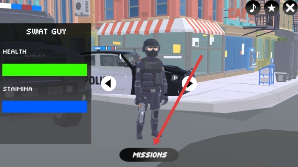 1、点击SWAT-GUY角色下方的MISSIONS按钮,进入任务选择界面,查看可参与的任务列表。