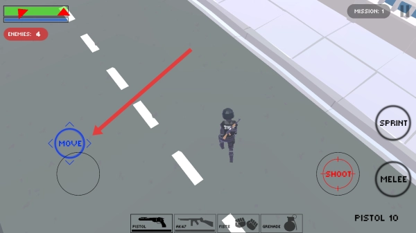 3、在任务关卡里,点击左侧的MOVE按钮就能操控SWAT角色移动,让角色靠近敌人,以此推进任务的进程。
