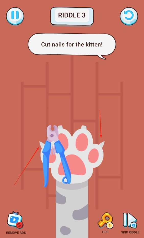 1、按照问题里说的,把旁边的指甲钳拖到猫爪那儿,把猫爪上锋利的指甲都剪掉就行,这样小猫就能去抓鱼了。