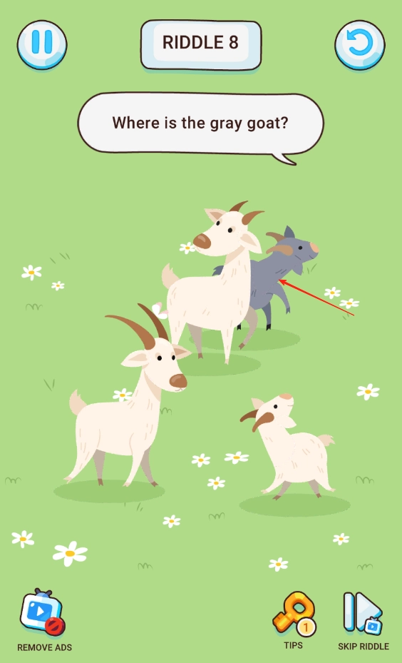 2、按照问题描述找到灰色小羊,把白色小羊移开——灰色小羊藏在白色小羊身后,接着再点击一下就能进入下一关了。