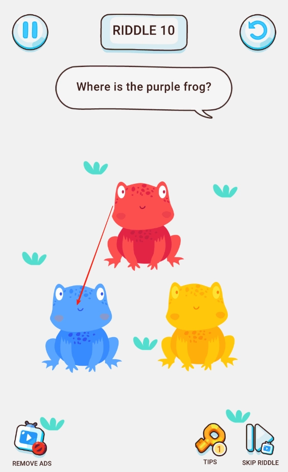 3、依据问题提示去寻找紫色青蛙,当前场景里并没有紫色青蛙。这时候我们得把蓝色青蛙和红色青蛙拖到一块儿,这样就能合成出紫色青蛙了。
