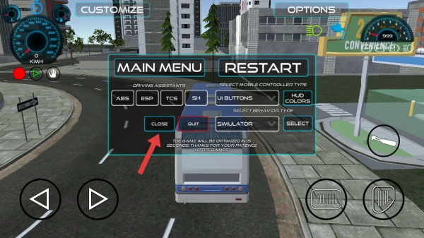 1、在游戏的设置弹窗里,得点击CLOSE按钮,关闭设置界面,回到巴士驾驶操作页面。