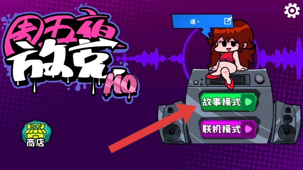 界面上设有故事模式、联机模式这两个选项,同时还有商店按钮、角色形象展示以及设置图标等元素,只有点击故事模式才能进入相应界面。