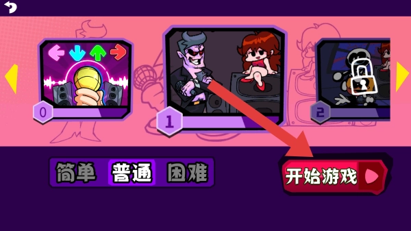 2、界面显示关卡0、1、2,其中2号关卡处于锁定状态;难度选项包含简单、普通、困难三个档位;此外还设有开始游戏按钮,以及与各关卡对应的角色和场景图案。