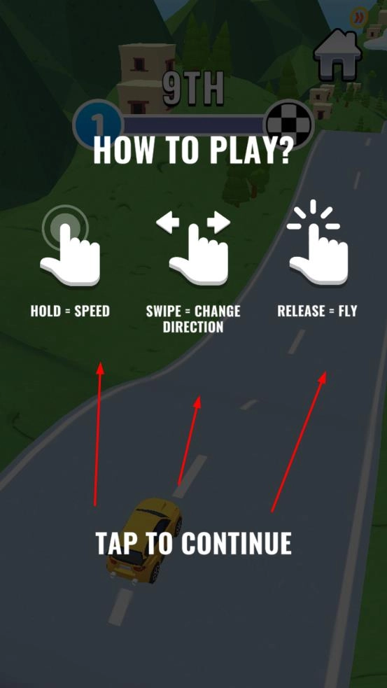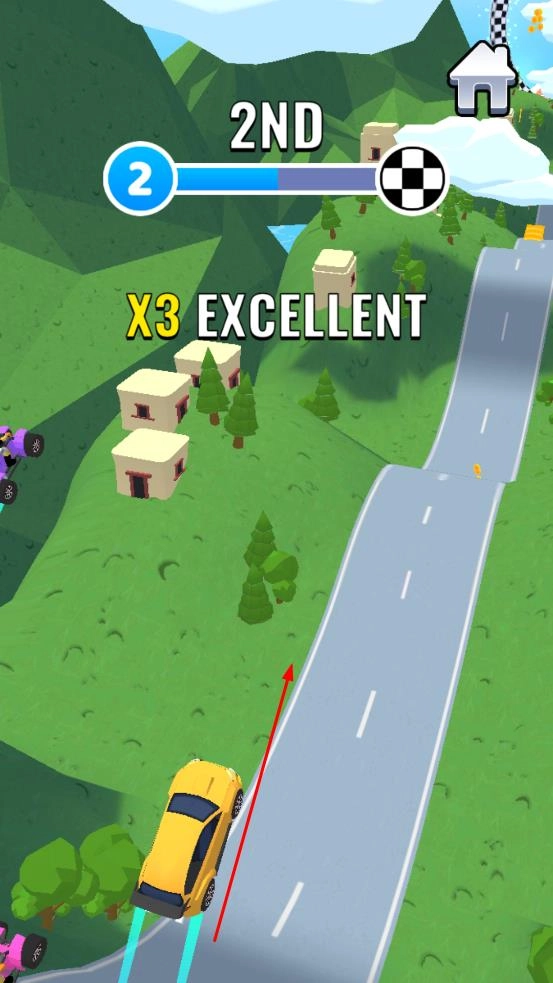1、长按屏幕可提升赛车速度,滑动屏幕能够调整行驶方向,松开屏幕赛车便会进入飞行状态。