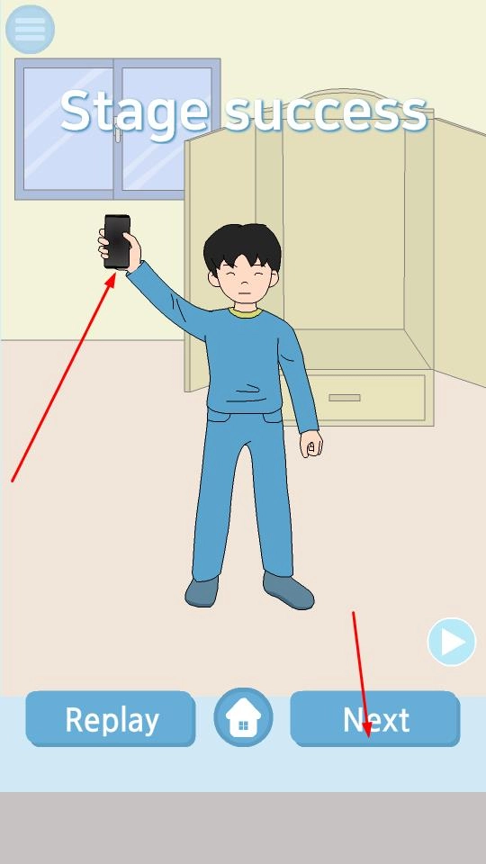 3、成功找到手机后,界面会显示“Stage success”,此时可以点击“Replay”按钮重新游玩当前关卡,或者点击“Next”按钮进入下一关,继续新的寻物挑战。