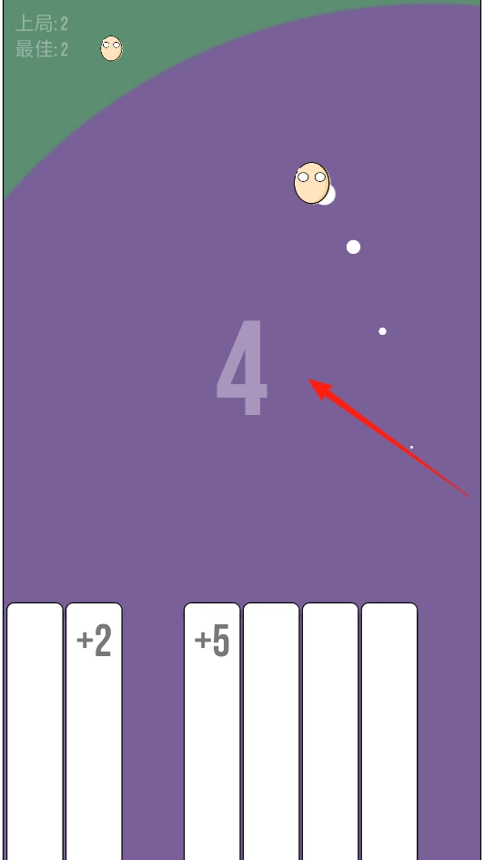 2、紫色背景中显示数字与带增益的钢琴键,小球自动下落,玩家需观察小球位置与钢琴键布局,点击对应钢琴键,同时避开空白区域,持续挑战让小球下落更久。