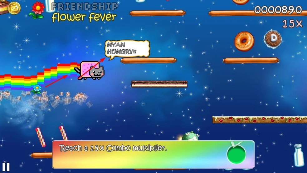 1、操控彩虹猫跳跃,收集甜甜圈、冰淇淋等食物与金币,触发combo提升得分。