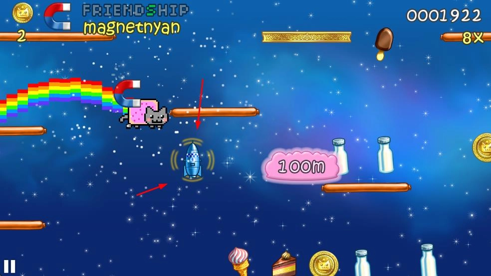 2、拾取火箭道具加速、磁铁道具吸金币,突破障碍,积累飞行距离如100m。