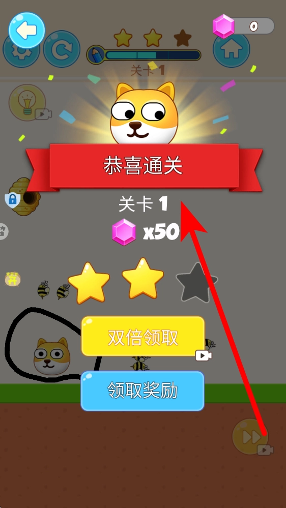 3、成功守护狗头后,场景会显示恭喜通关的提示,同时可获取宝石等奖励,这些奖励能用来解锁新内容,助力玩家继续挑战更高难度的关卡,进而提升画线的策略性与保护效果。