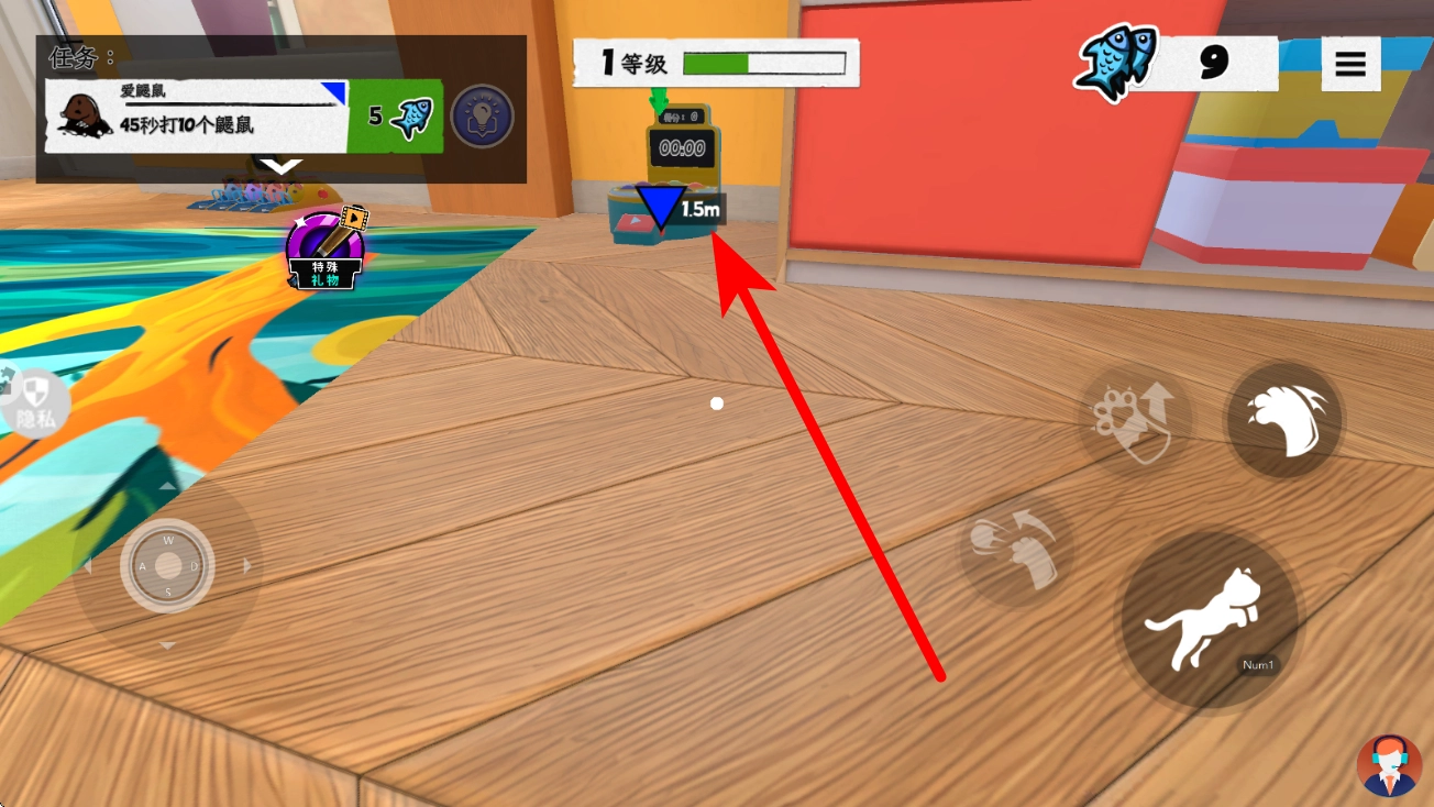 1、进入场景后,按照任务指引箭头的提示,操控宠物向打鼹鼠装置移动;当箭头显示距离装置一米五时,继续移动直至抵达,此时装置将自动触发开启,进入任务准备状态。