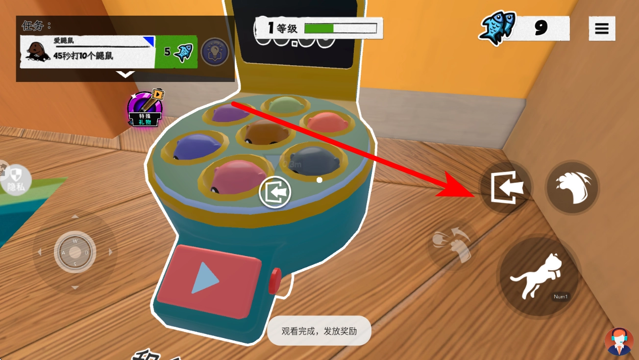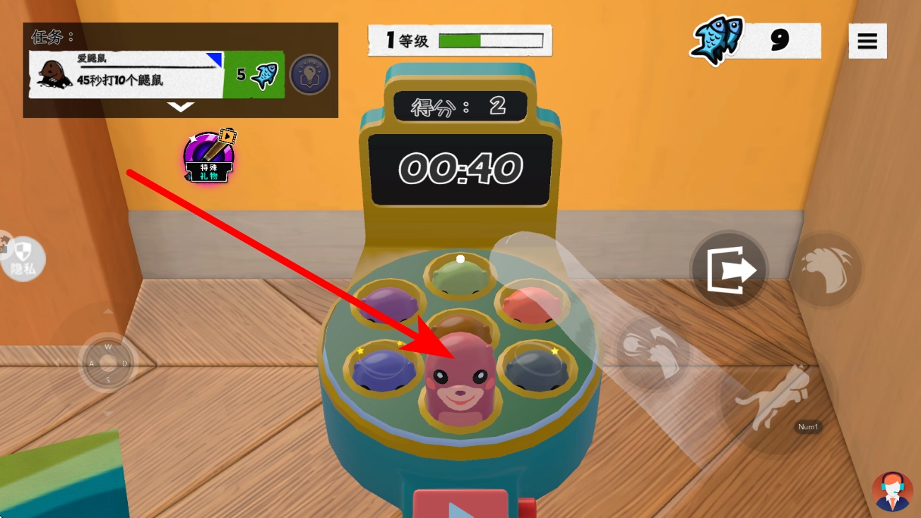 装置开启后,点击右侧对应的操作按钮(退出键或互动键),即可启动打鼹鼠玩法。游戏过程中,鼹鼠会从孔洞中弹出,玩家需把握时机,通过释放宠物技能或直接点击的方式击打鼹鼠。