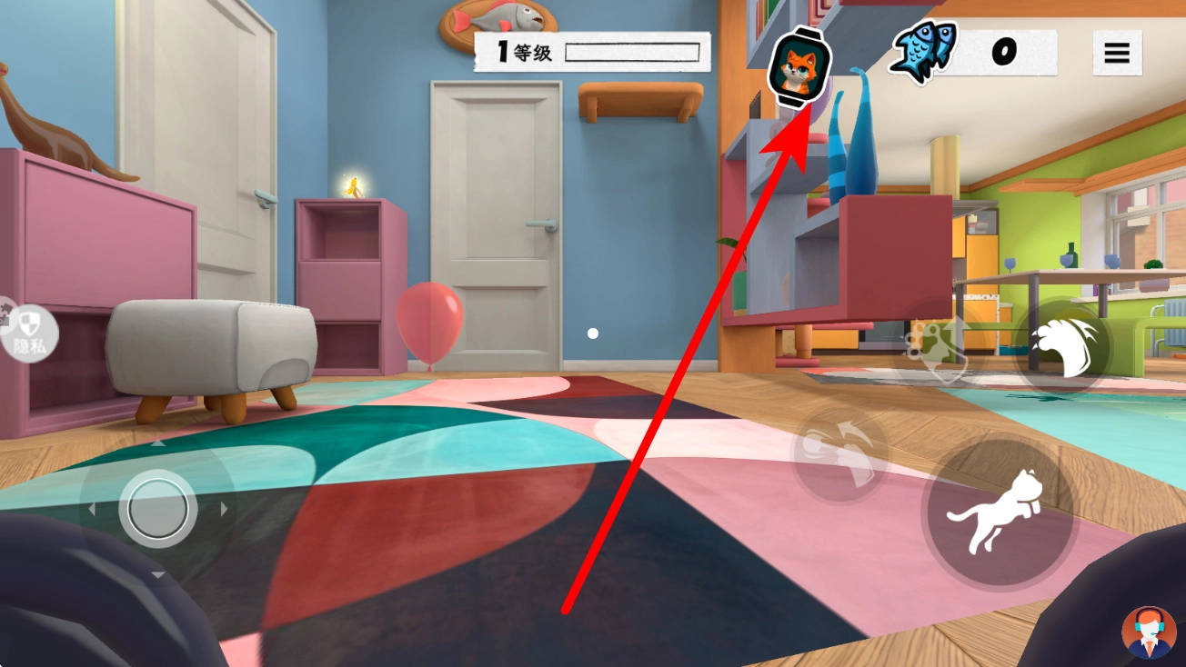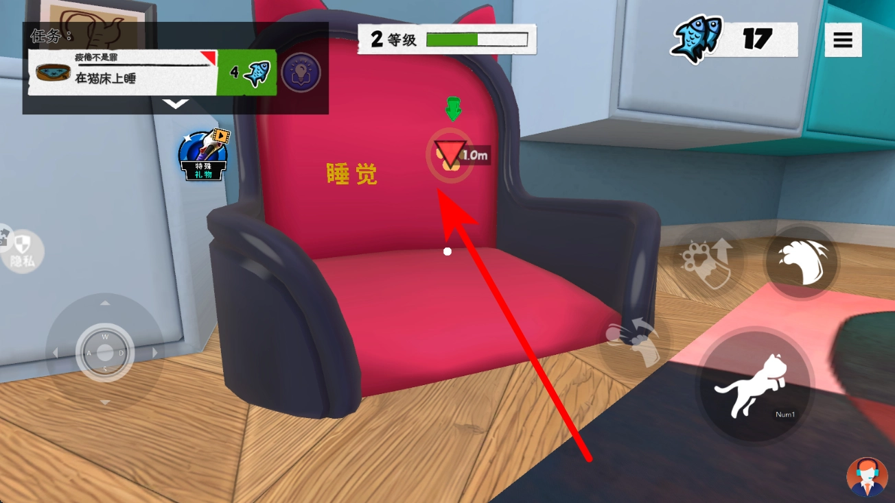 1、新手在完成“疲倦不是罪”任务后,查看任务栏的指引内容,接着操控宠物进行移动,按照箭头提示去寻找猫床,当靠近显示有睡觉标识的猫床时,就可以准备进行互动操作了。