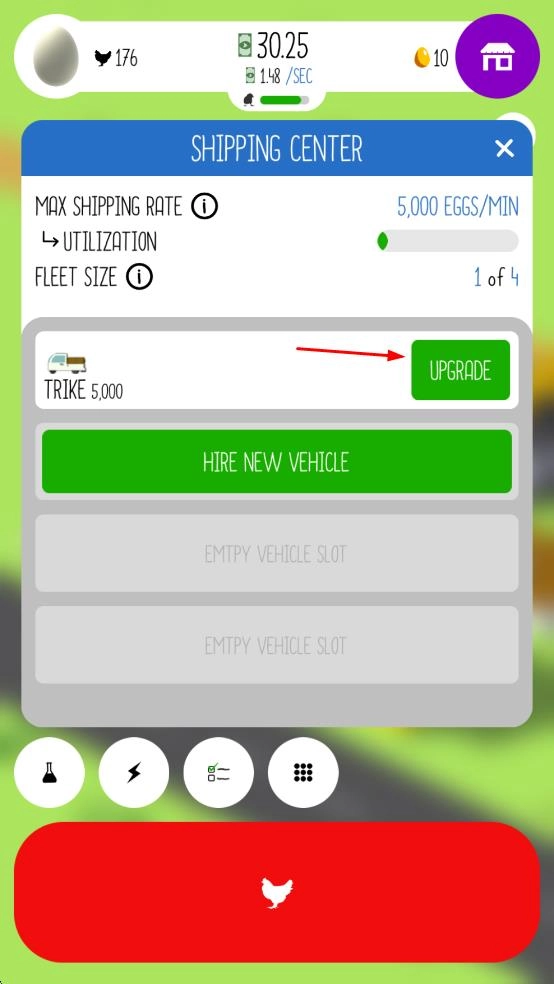 2、进入运输中心,升级车辆、雇佣新车,提升鸡蛋运输效率。