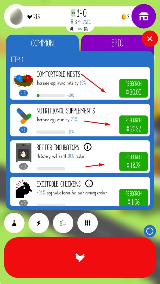 1、点击红色按钮获取鸡,鸡自动产蛋,积累金币与鸡蛋资源。