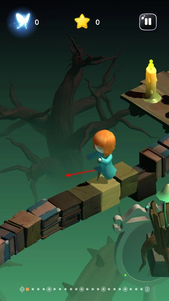 1、操控角色在木栈道上移动,收集发光的蝴蝶和星星,拾取时钟道具,解锁场景的变化。