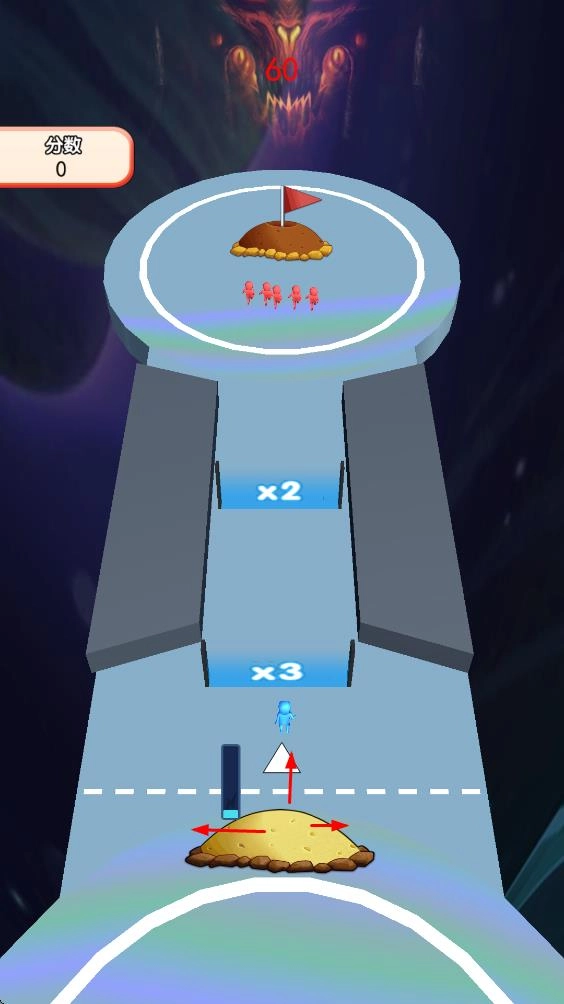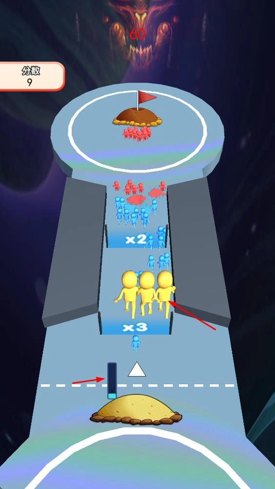 1、滑动箭头调整小人出发方向,使其通过路径上的倍数门x2,数量倍增。