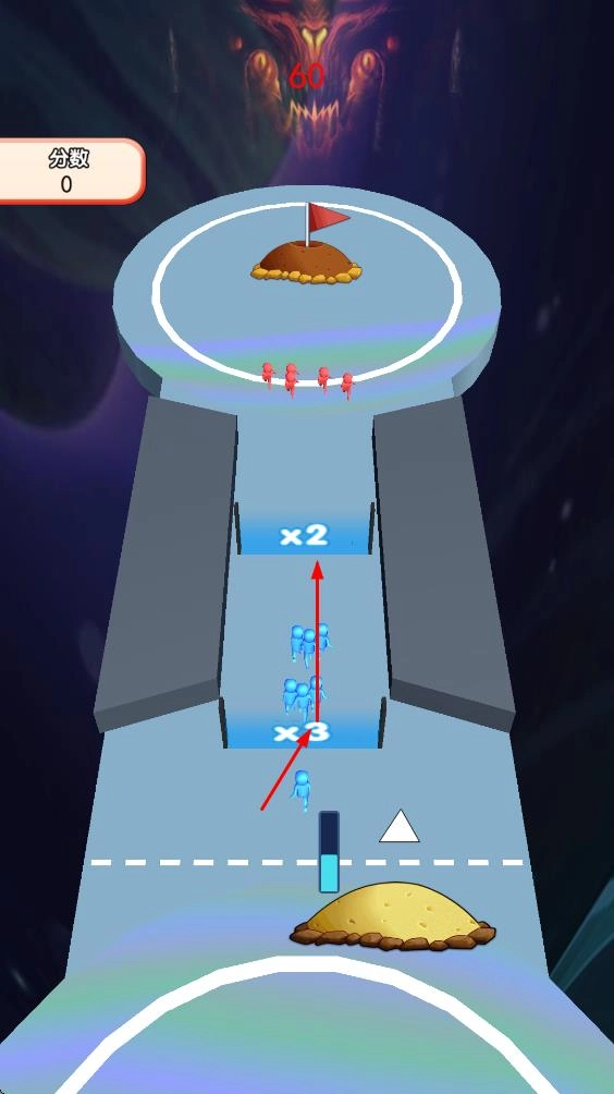 2、倍增后的小人向上进攻,与顶部红色敌人争夺旗帜阵地,击败敌人积累分数。