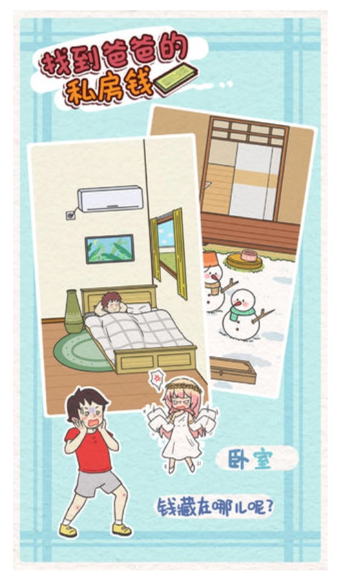 找到爸爸的私房钱免费版带来趣味解谜新体验,化身小侦探,在精心布置的房间中寻找隐藏线索。Q萌画风搭配烧脑谜题,考验观察力与逻辑思维。从日常物品到隐秘角落,随着剧情推进,解锁更多精彩关卡和趣味道具,快来展开这场妙趣横生的寻宝之旅吧。
