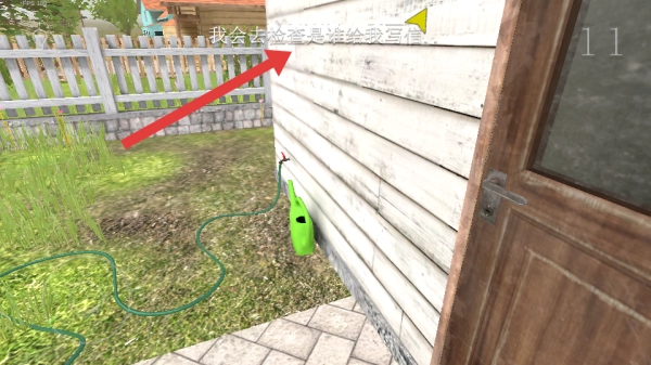 2、找到绿色喷壶后,点击尝试与之互动;结合角色需要检查信件的剧情,去探索房屋周边区域,寻找可能藏有信件的地方。