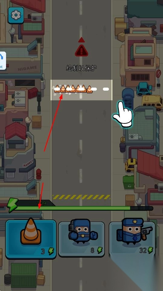 1、点击“绘制以保护”,消耗能量放置路障(锥形桶),阻挡僵尸前进路线,守护城市。