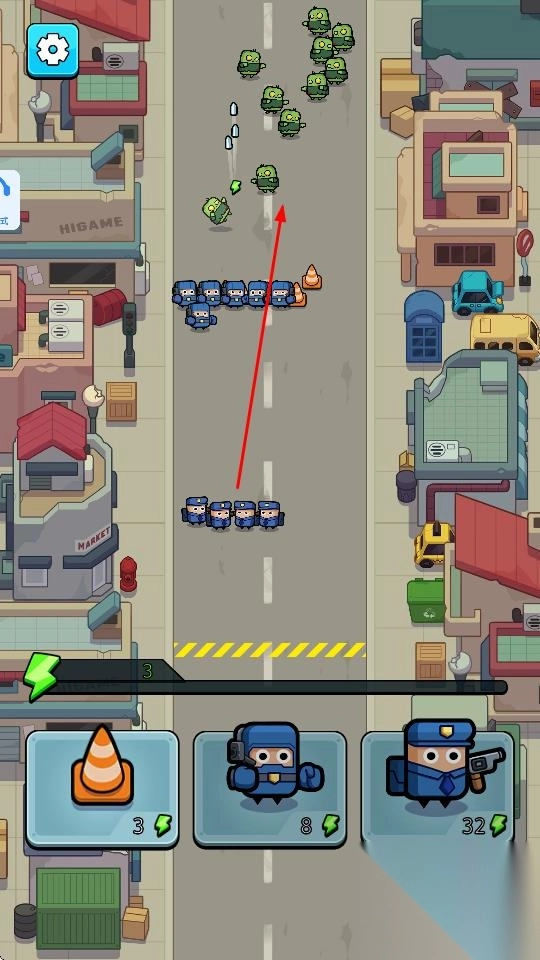 2、消耗能量部署兵种(警察、忍者),在道路排兵布阵,自动攻击来袭僵尸,推进关卡。