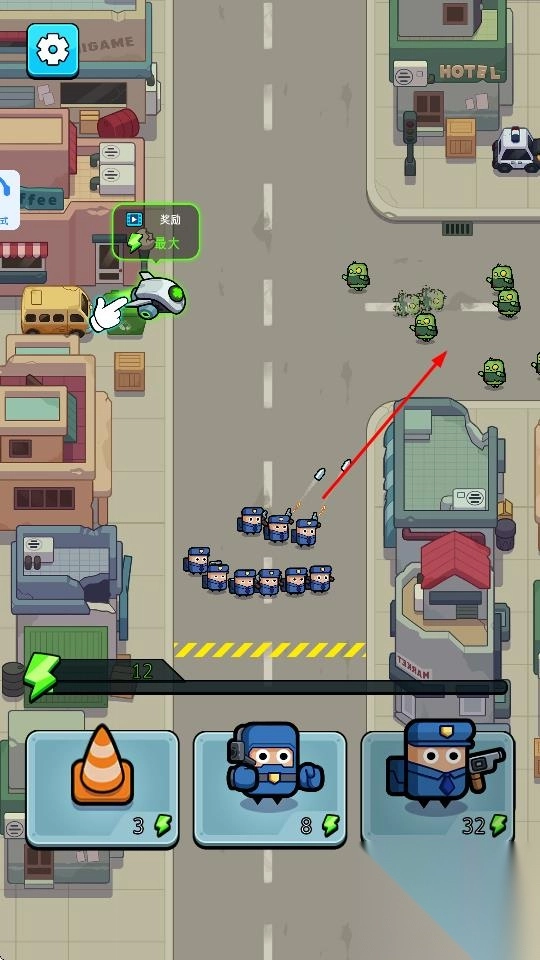 3、战斗中获取奖励,升级兵种、解锁技能,应对更多僵尸波次,扩大防御范围,保卫城市安全。