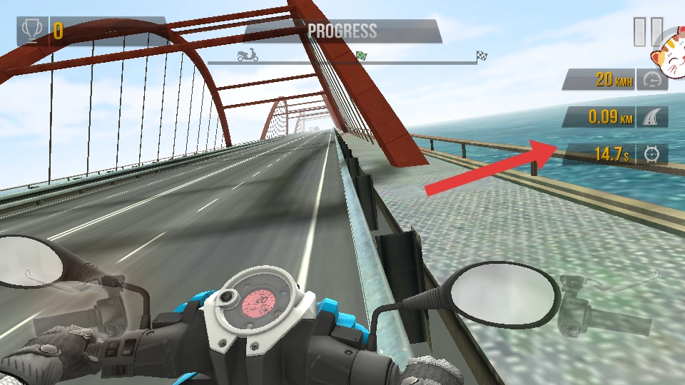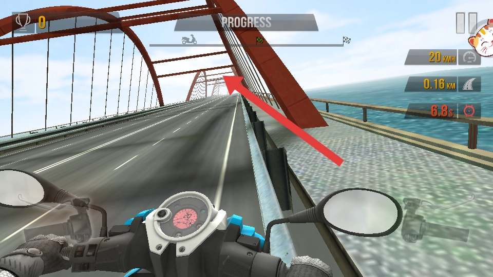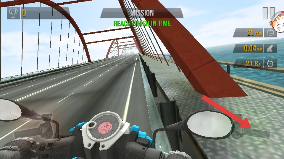 1、驾驶摩托车在桥梁赛道行驶,需在REACH FINISH IN TIME提示的规定时间内,抵达终点完成闯关。
