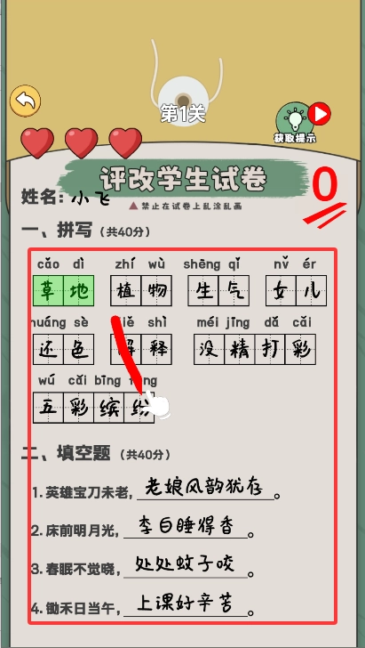 2、找出试卷上的错误,并打叉,找出所有错误即可过关。