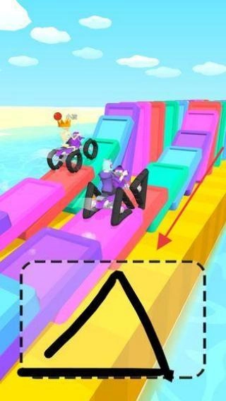 2、遇彩色方块坡道,绘制三角形状支撑载具爬坡,保持形状稳固,让载具顺利越过多层障碍,注意绘制时机,避免载具碰撞失败。