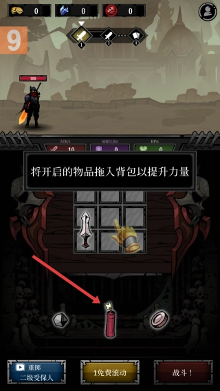 2、整理背包:拖动红色蜡烛至背包空格,配置道具提升战力。