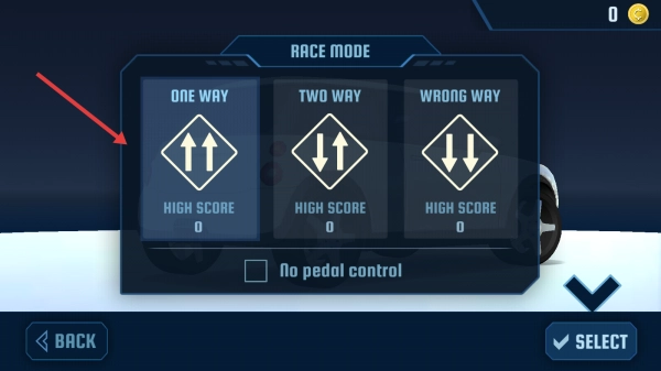 1、点击主界面的播放按钮进入模式选择界面,首次体验建议选择“ONE WAY”(单向)模式来熟悉赛道规则,点击【SELECT】按钮确认选择后,即可驾驶白色赛车开始比赛。