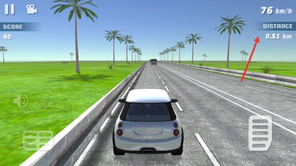 2、在公路行驶过程中,操控赛车方向以避开其他车辆,同时留意右上角的“DISTANCE”(距离)和“km/h”(速度)显示,尽量保持较高车速,借助单向车道的优势完成超车动作,以此积累游戏分数。
