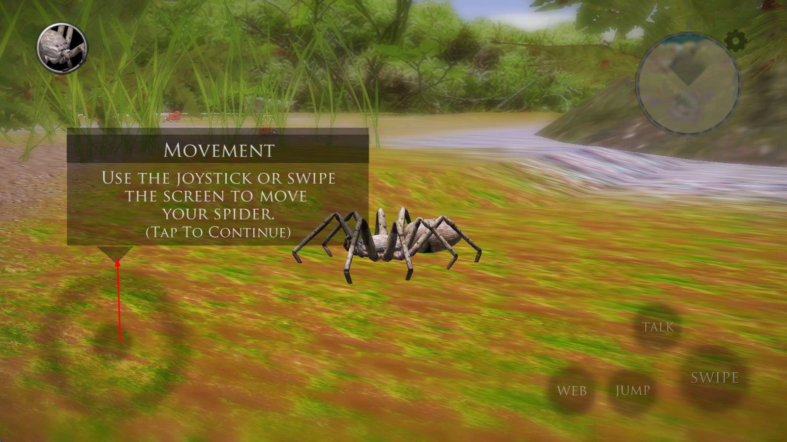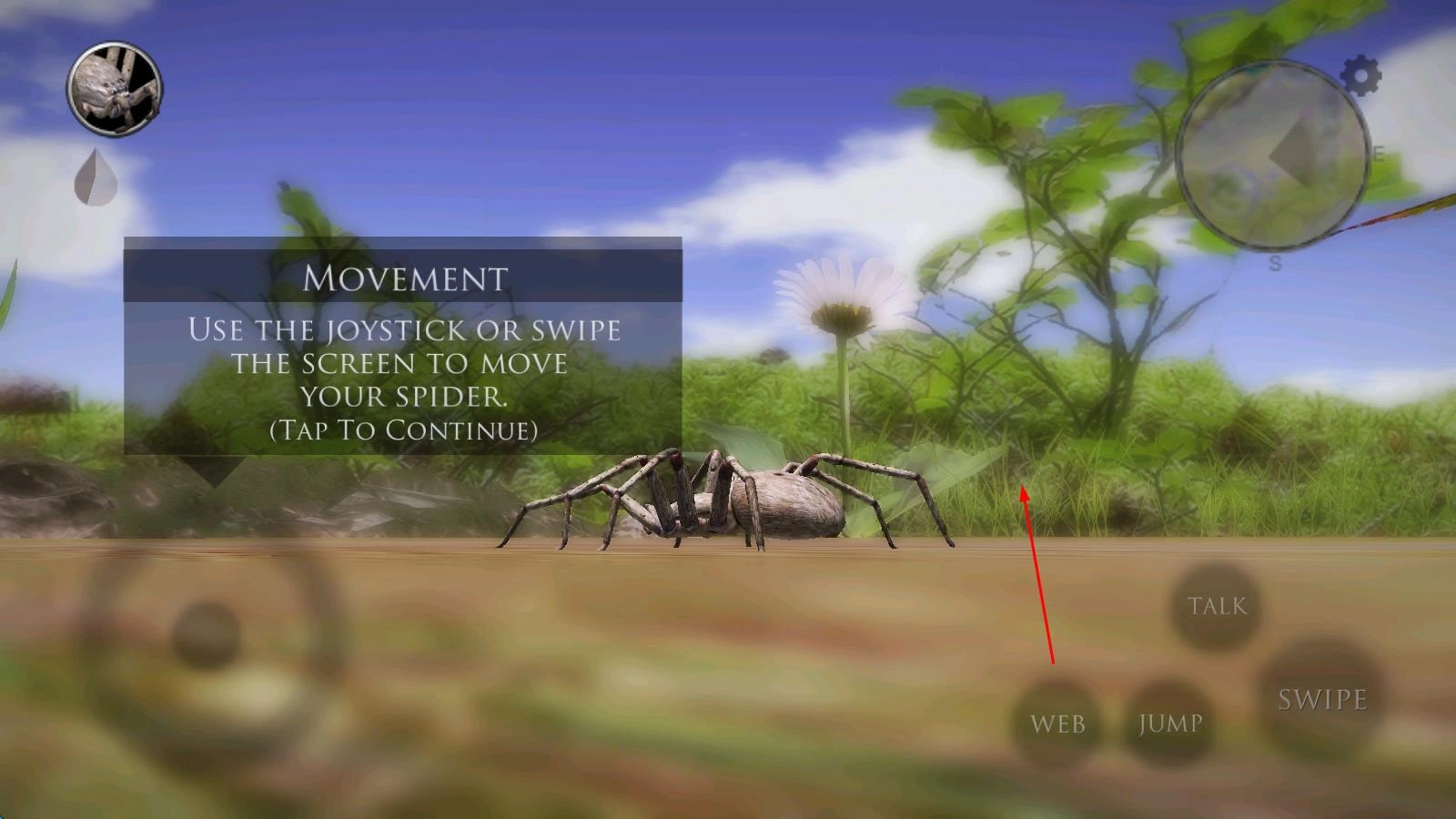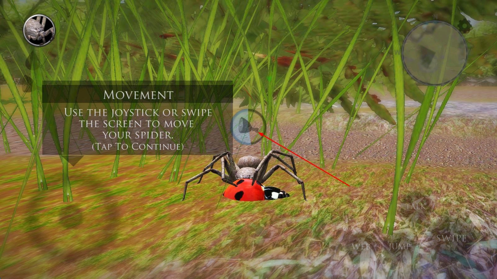 1、进入游戏后,选择初始蜘蛛品种,在丛林地图中通过虚拟摇杆控制移动,利用吐丝键搭建蛛网陷阱,等待昆虫落入捕猎范围。