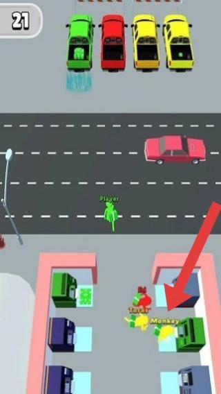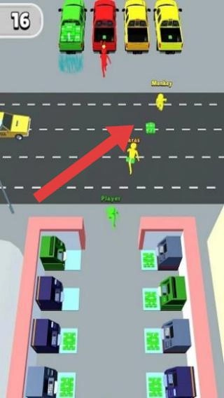 1、不同颜色小人(代表玩家及其他阵营)、车辆、建筑设施,呈现多人在城市道路场景中,通过吞噬等方式壮大己方人群的玩法特征。