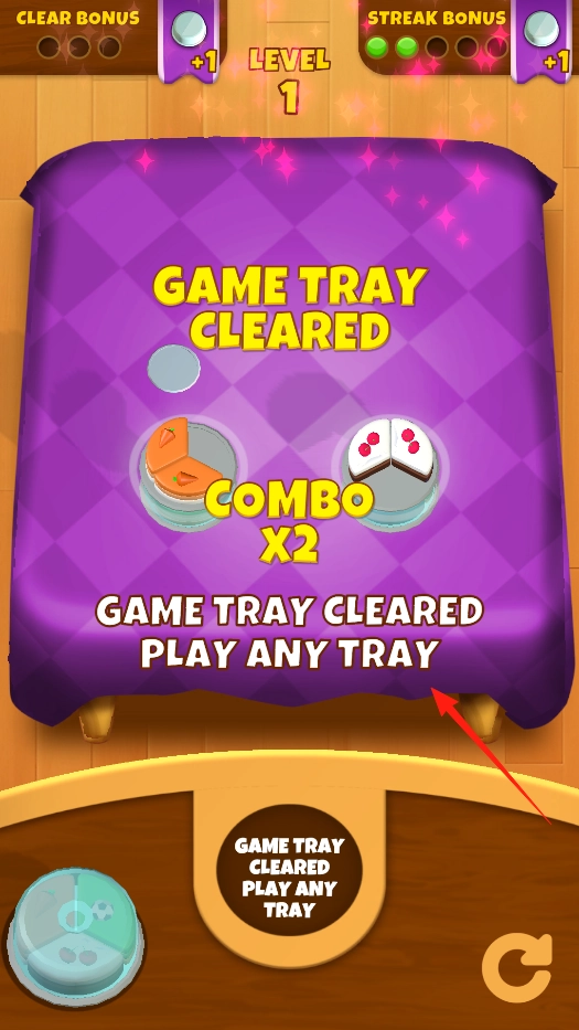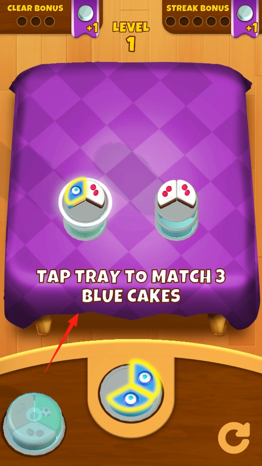 1、点击托盘放置蛋糕,通过匹配3个蓝色蛋糕来完成消除,以此推进关卡,感受蛋糕匹配的机制。