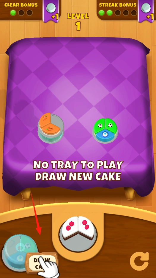 3、当托盘没有可用蛋糕时,点击“DRAW CAKE”抽取新蛋糕来补充托盘,这样就能开启新的消除环节,同时体验资源补充的机制。