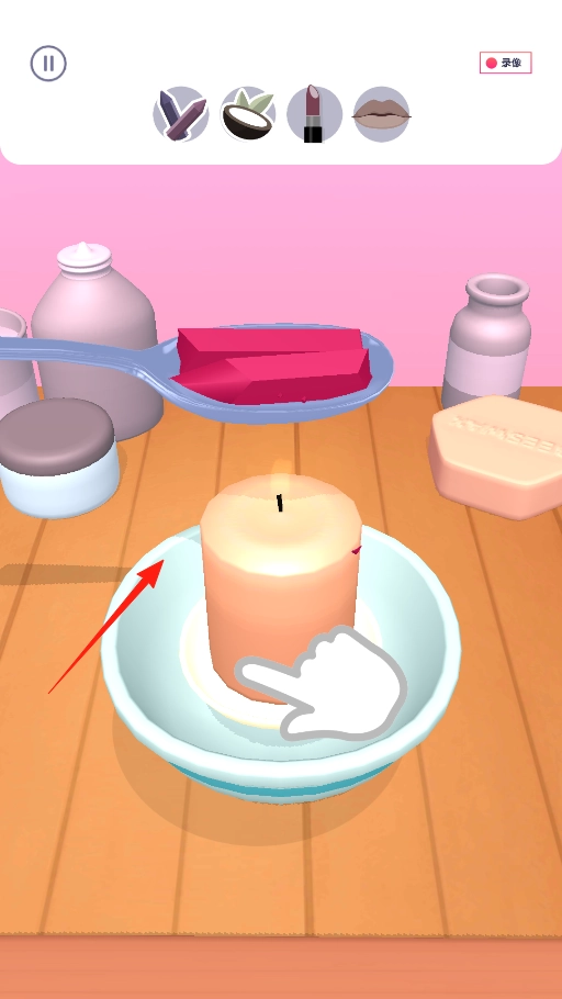 1、拖动蜡烛靠近碗,使材料受热融化,随后按照指引开启手工制作流程,体验材料预处理的操作机制。