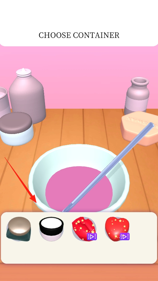 2、观察粉色液体,挑选合适容器,点击下方样式将制作物装入其中,完成包装环节,感受容器选择的趣味玩法。
