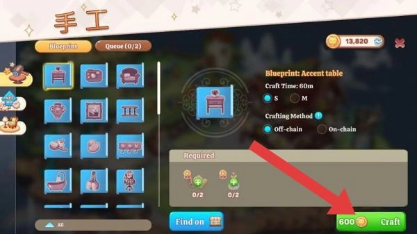 2、当前显示正准备制作名为“Accenttable”的物品。该物品制作需消耗2个绿色果实,耗时60分钟,制作方式选择“On-chain”,并花费600金币,点击【Craft】按钮即可尝试制作。