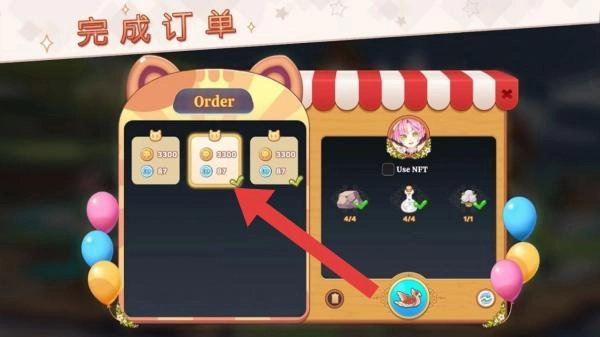 3、画面展示订单相关内容,设有多个订单选项,右侧呈现可使用的材料以及“UseNFT”(使用非同质化代币)等信息,玩家能够在此处处理订单任务,推动经营等玩法的进行。