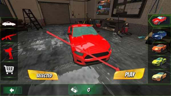 2、选择红色的载具,点击【PLAY】按钮后,挑选要驾驶的车辆,在城市里完成各项任务,以此推动游戏的进度。