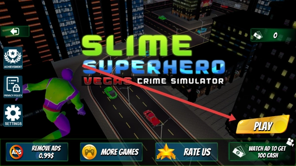 1、在主界面,点击【PLAY】按钮,进入《Slime-Superhero》游戏,开启维加斯犯罪模拟冒险之旅。