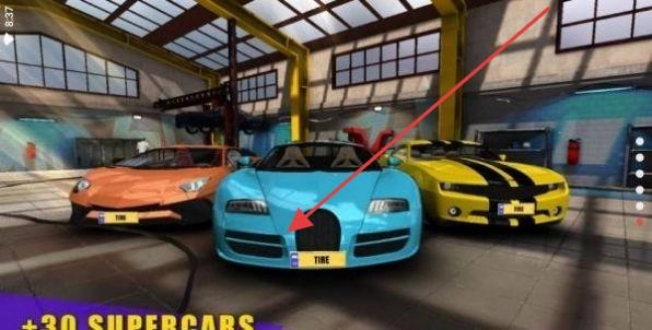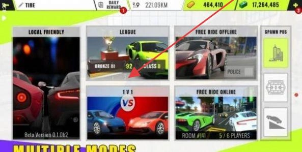 2、战“1V1对决”!点选“1V1”模式,用蓝色布加迪匹配对手,2步确认开局,别犹豫,完成赛事得3倍奖励,超赚,提升车辆。