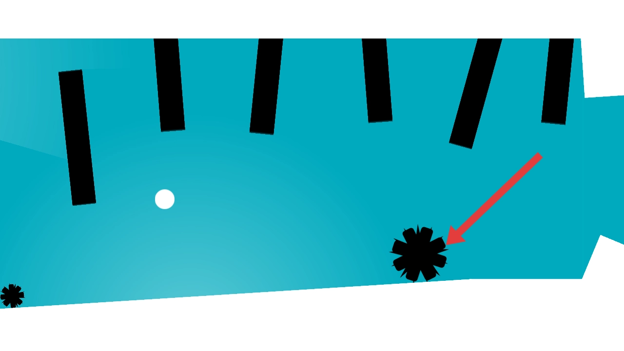 进入第二关后,要留意屏幕上箭头所指的黑色尖刺障碍物,操控白球滚动时得精准躲开这些危险区域,同时借助右侧安全区域的地形特征。
